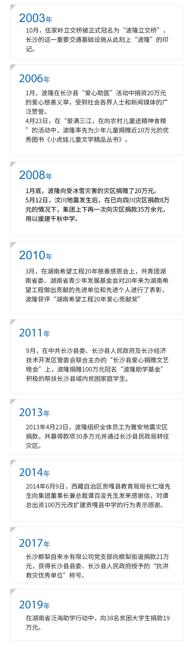 從創業生存到百花齊放,從企業的本能生長到高速發展,再到全面升級,波隆始終與時代共進步。基于企業公民精神,波隆致力于讓更多的人共享美好生活,持續投身公益活動,將愛心與善意向社會傳遞。