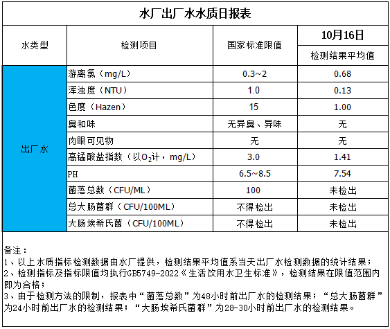 水廠(chǎng)出廠(chǎng)水水質(zhì)日?qǐng)?bào)表(2025-10-16)